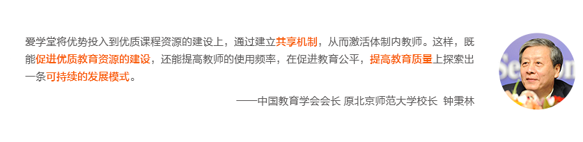 爱学堂为政府、学校、师生提供优质的课程资源和平台技术服务,帮助区域和学校搭建教育资源平台和智慧教学系统,为学生提供个性化学习产品,通过教育资源平台扩大优质教育资源覆盖面,通过智慧教学系统创新课堂教学模式,从而提高课堂效率,实现区域发展公平而有质量的教育。现已为全国25个省(含香港、澳门特别行政区)、107个城市、20000所学校、500万用户提供教育服务。(内部数据,仅供参考,最终解释权在爱学堂)